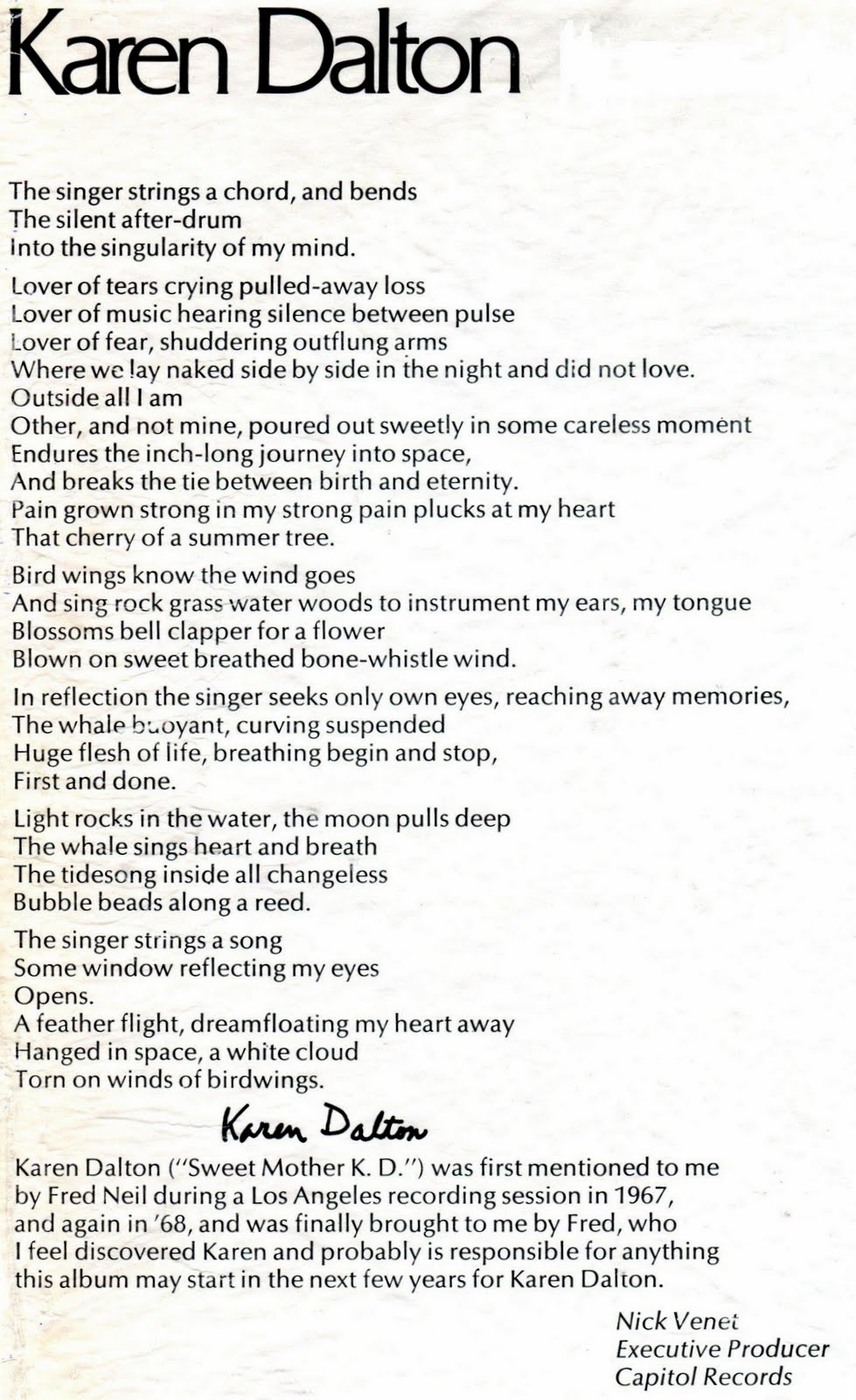 I'll also add here a section of the back cover of the album, as it's the only place I've ever seen any original writing by Dalton, and also includes her signature, as well as giving full credit to Fred Neil for alerting the world to her talent: